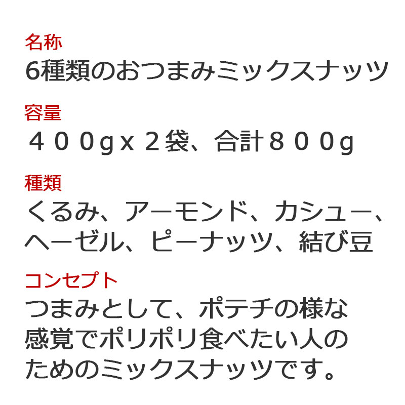 商品情報 商品名 ミックスナッツ(6種のミックス) 内容量 800g (2x400g) 原材料 くるみ(チリ産)、アーモンド(アメリカ産)、カシューナッツ(インド産)、ヘーゼルナッツ(トルコ産)、バターピーナッツ(中国産)、むすび豆(中国産)、植物油脂、食塩 保存法 直射日光、高温多湿を避けて保存して下さい。