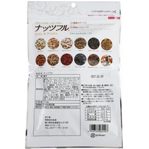商品名ナッツフル 内容量150g 成分・原材料落花生、フレームレーズン、サルタナレーズン、砂糖、いちじく、カランツレーズン、クランベリー、アーモンド、くるみ、グリーンレーズン、カシューナッツ、植物油、マカダミアナッツ、ココアパウダー、脱脂粉乳、米粉、ホエイパウダー、全脂粉乳、食塩、澱粉、コーンシロップ、ゼラチン/乳化剤、安定剤(アラビアガム)、着色料(ベニコウジ、フラボノイド、クチナシ、パプリカ色素、アントシアニン、スピルリナ青)、香料、調味料(アミノ酸)、光沢剤、(一部に乳成分・落花生・カシューナッツ・大豆・くるみ・ゼラチンを含む) 保存方法直射日光、高温・多湿を避けて常温で保存してください。