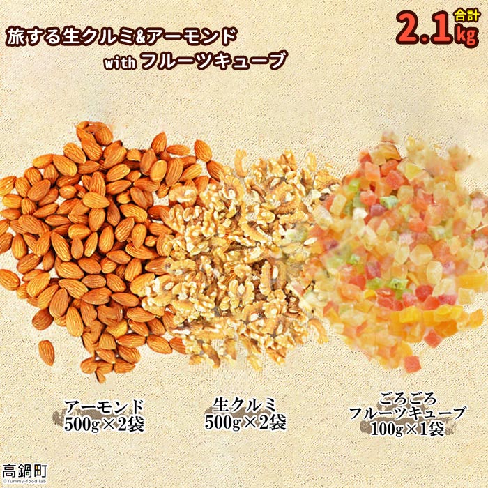 【ふるさと納税】合計 2.1kg<旅する生クルミ&アーモンドセット with フルーツキューブ>※2020年7月末迄に順次出荷します! くるみ 胡桃 ドライフルーツ 子供会 敬老 妊婦 海と太陽 ヤミー・フードラボ 宮崎県 高鍋町【常温】